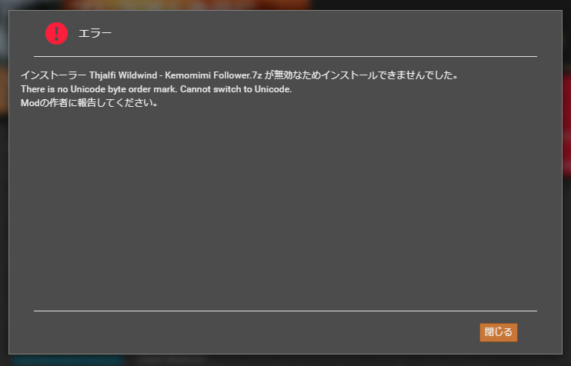 Vortex v1.4.5(?)~v1.4.6でUnicodeエラーにより拙作modのFomodインストーラが起動しないという報告を受けています。本体をv1.4.7以上に更新すると解決します。